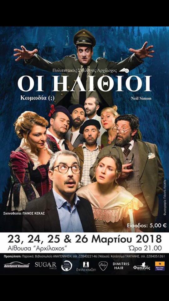 Ο Πολιτιστικός σύλλογος Αρχίλοχος συνεχίζοντας την επιτυχημένη πορεία του στο ανέβασμα σημαντικών θεατρικών έργων, παρουσιάζει την παράσταση ΟΙ ΗΛΙΘΙΟΙ του Αμερικανού συγγραφέα Neil Simon σε σκηνοθεσία Πάνου Κέκα.