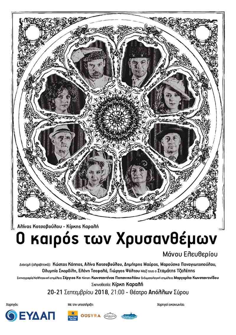 Πρεμιέρα στο Θέατρο Απόλλων της Σύρου θα κάνει στις 21 & 22 Σεπτεμβρίου 2018 η θεατρική παράσταση «Ο καιρός των χρυσανθέμων», βασισμένη στο ομότιτλο μυθιστόρημα του Μάνου Ελευθερίου.