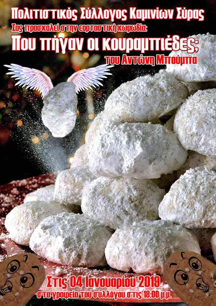 Ο Πολιτιστικός Σύλλογος Καμινίων Σύρας σας προσκαλεί στην εορταστική κωμωδία: "Πού πήγαν οι κουραμπιέδες;" του Αντώνη Μπούμπα.