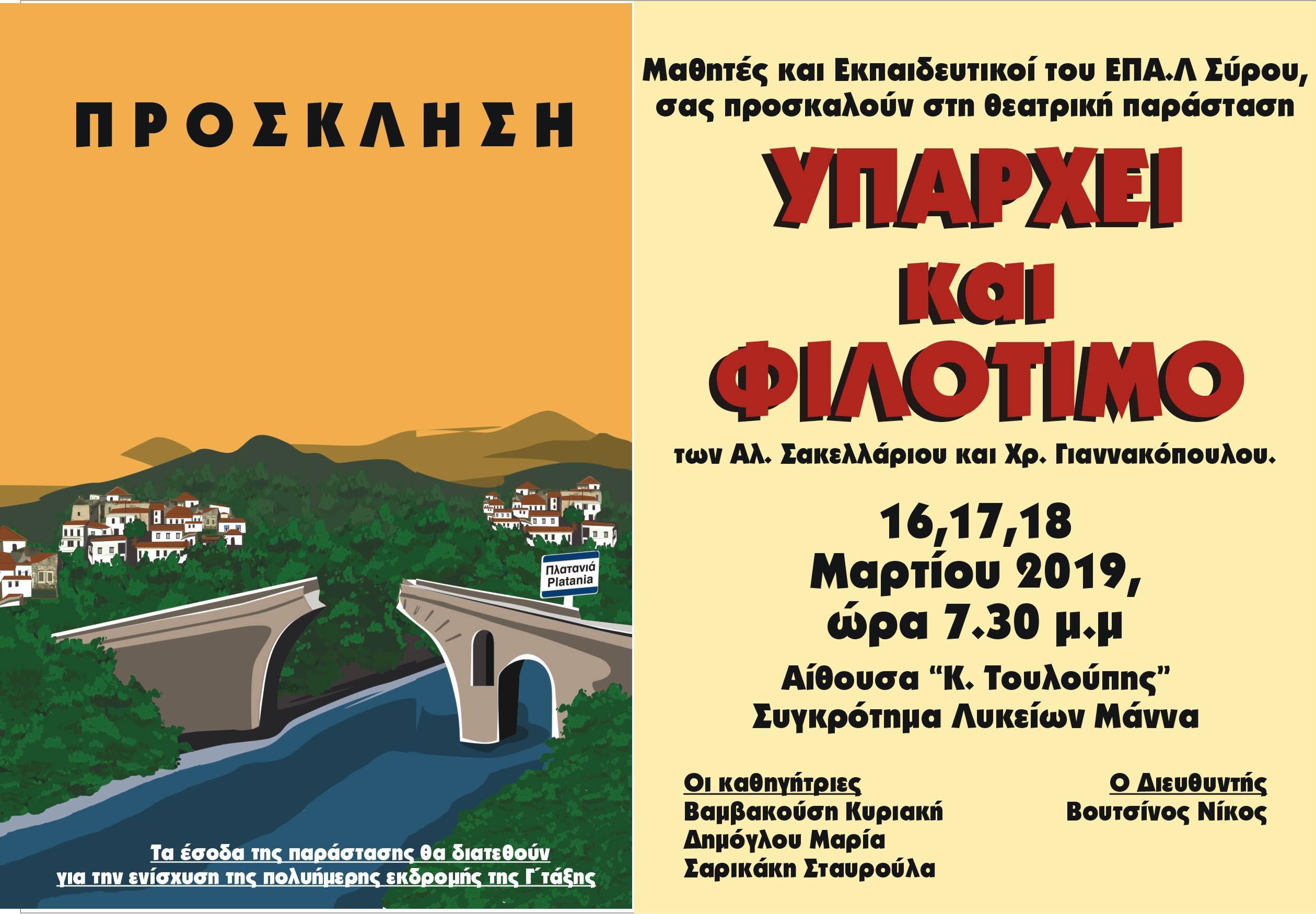 Οι μαθητές και οι εκπαιδευτικοί του Ημερήσιου ΕΠΑΛ Σύρου σας προσκαλούν στη Θεατρική Παράσταση «ΥΠΑΡΧΕΙ ΚΑΙ ΦΙΛΟΤΙΜΟ» των Αλέκου Σακελλάριου - Χρήστου Γιαννακόπουλου στις 16 – 17 – 18 Μαρτίου 2019 και ώρα 19:30 στην αίθουσα «ΚΩΝ/ΝΟΣ ΤΟΥΛΟΥΠΗΣ» του συγκροτήματος σχολείων στο Μάννα.