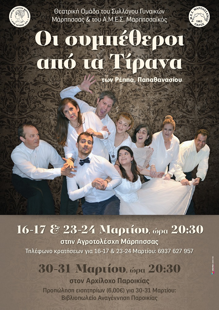 Η θεατρική ομάδα του Συλλόγου Γυναικών Μάρπησσας και του ΑΜΕΣ Μαρπησσαϊκού παρουσιάζει την κωμωδία των Ρέππα-Παπαθανασίου " Οι συμπέθεροι από τα Τίρανα".