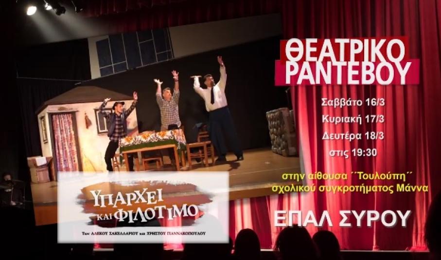 Το γραφείο του Υπουργού Εθνικής Ανασυγκροτήσεως και Περιθάλψεως, Ανδρέα Μαυρογιαλούρου ανοίγει αύριο στην αίθουσα πολλαπλών χρήσεων «Κωνσταντίνος Τουλούπης» και θα λειτουργήσει έως και τη Δευτέρα 18 Μαρτίου 2019 (19:30), στο πλαίσιο της θεατρικής παράστασης του ΕΠΑΛ Σύρου «Υπάρχει και Φιλότιμο».