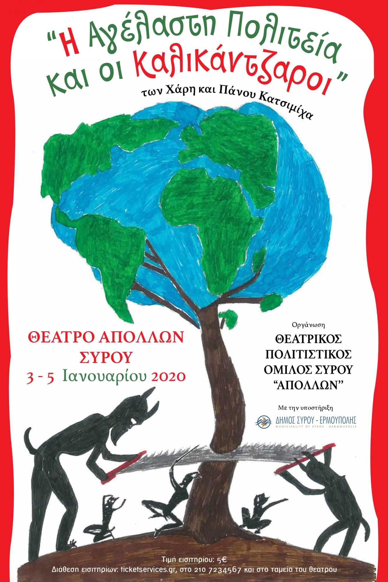 Στο πλαίσιο του Πολιτιστικού Προγράμματος του Δήμου Σύρου- Ερμούπολης «Χριστούγεννα Μαζί», ο Θεατρικός Πολιτιστικός Όμιλος Σύρου «ΑΠΟΛΛΩΝ» διοργανώνει την παράσταση «Η Αγέλαστη Πολιτεία και οι Καλικάντζαροι» στο Θέατρο Απόλλων την Παρασκευή 3 Ιανουαρίου 2020 και το Σάββατο 4 Ιανουαρίου 2020 και ώρα 18.00 και την Κυριακή 5 Ιανουαρίου 2020 και ώρα 12.00.