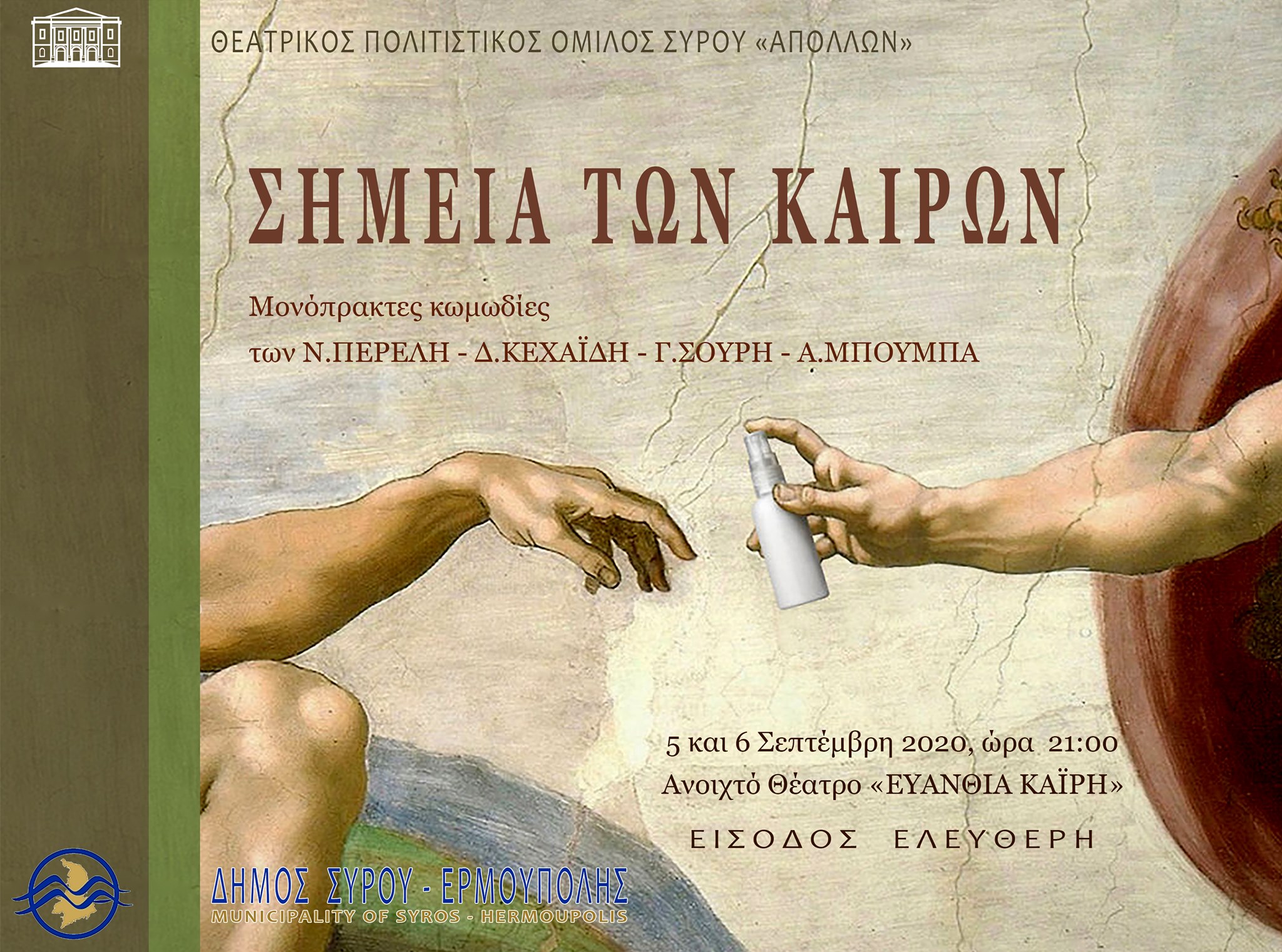 Στη δύσκολη αυτή συγκυρία, ο Θεατρικός Πολιτιστικός Όμιλος Σύρου «Απόλλων» δίνει το «παρών» στο πρόγραμμα «Σύρος – Πολιτισμός 2020» και επιχειρεί με τέσσερις μονόπρακτες κωμωδίες επιχειρούμε να αποδομήσει κάθε δυσάρεστο συναίσθημα.