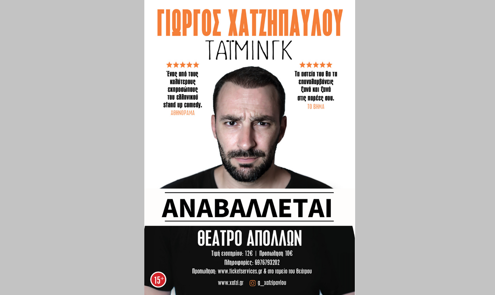 Αναβάλεται η stand-up παράσταση «Τάιμινγκ» του Γ. Χατζηπαύλου στο Θέατρο Απόλλων