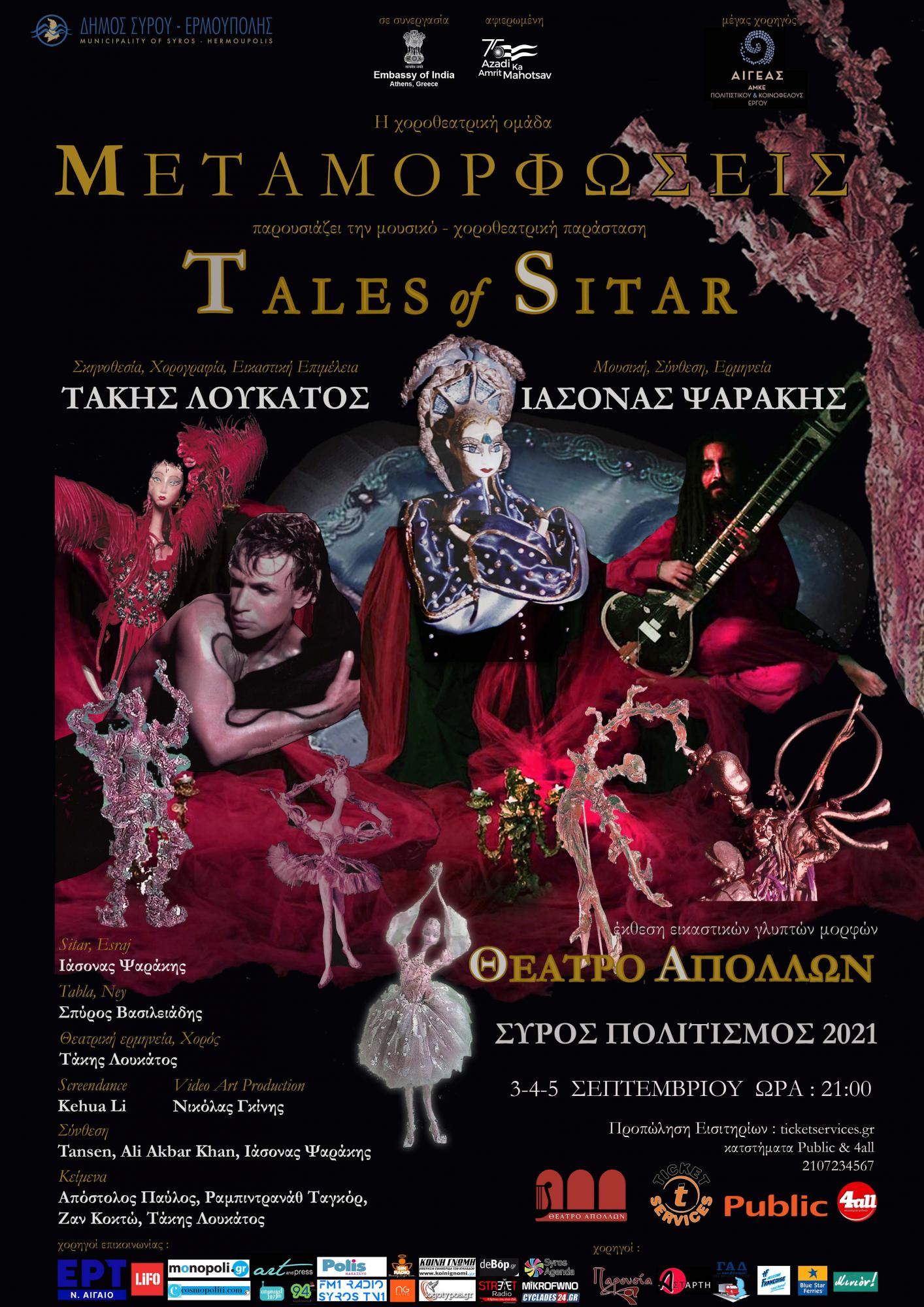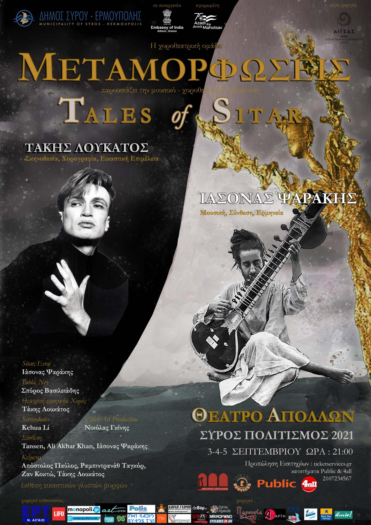 Η χοροθεατρική ομάδα «Μεταμορφώσεις» σε συνεργασία με την Ινδική Πρεσβεία, με αφορμή του εορτασμού των εβδομηνταπέντε χρόνων της ημέρας της Ανεξαρτησίας της Ινδίας, παρουσιάζει την μουσικό – χοροθεατρική παράσταση "Tales of Sitar" των Τάκη Λούκατου και Ιάσονα Ψαράκη στο πλαίσιο του Θεσμού «Σύρος Πολιτισμός 2021» στο ιστορικό Θέατρο «Απόλλων» στις 3-4-5 Σεπτεμβρίου 2021 .