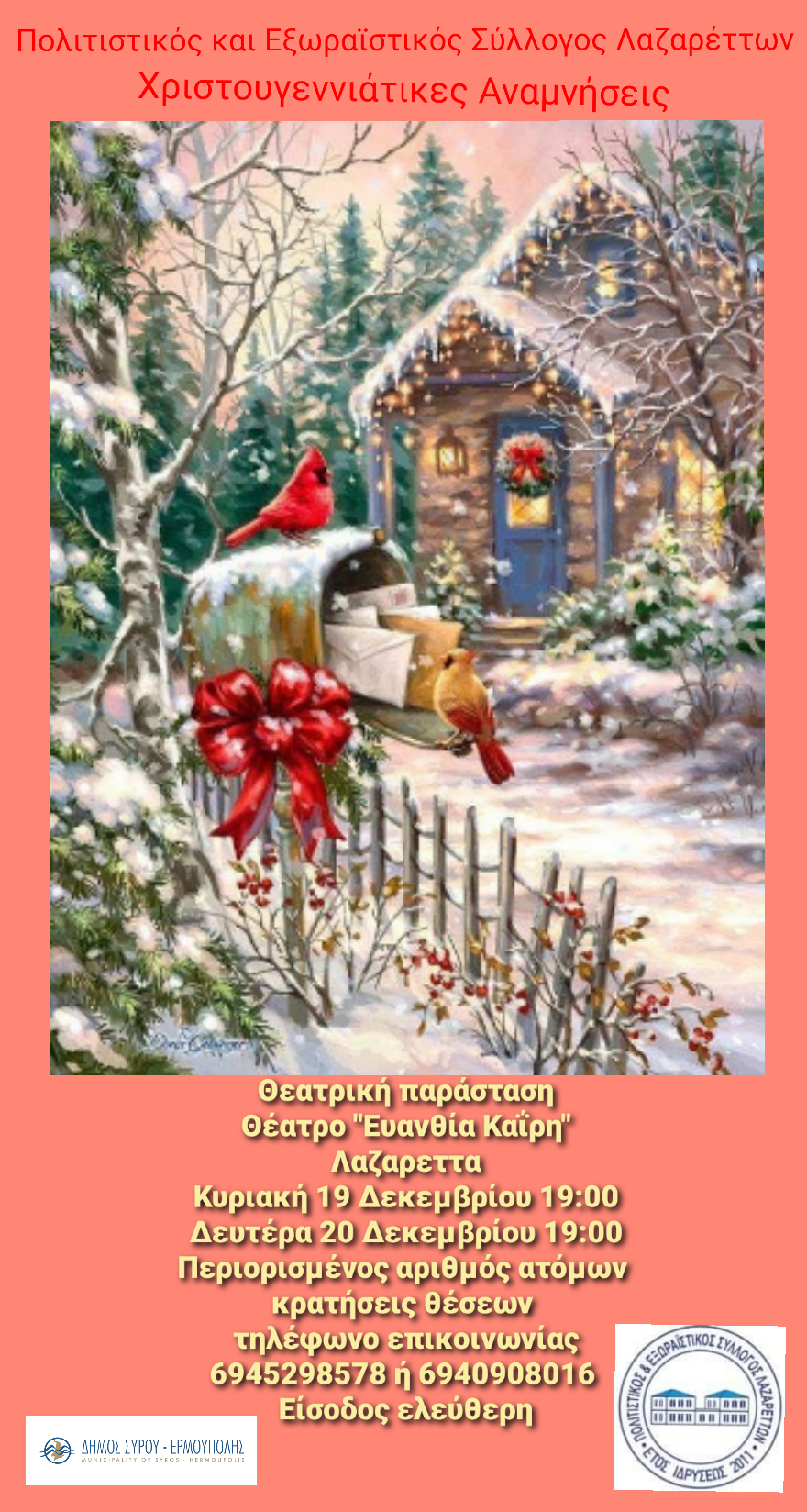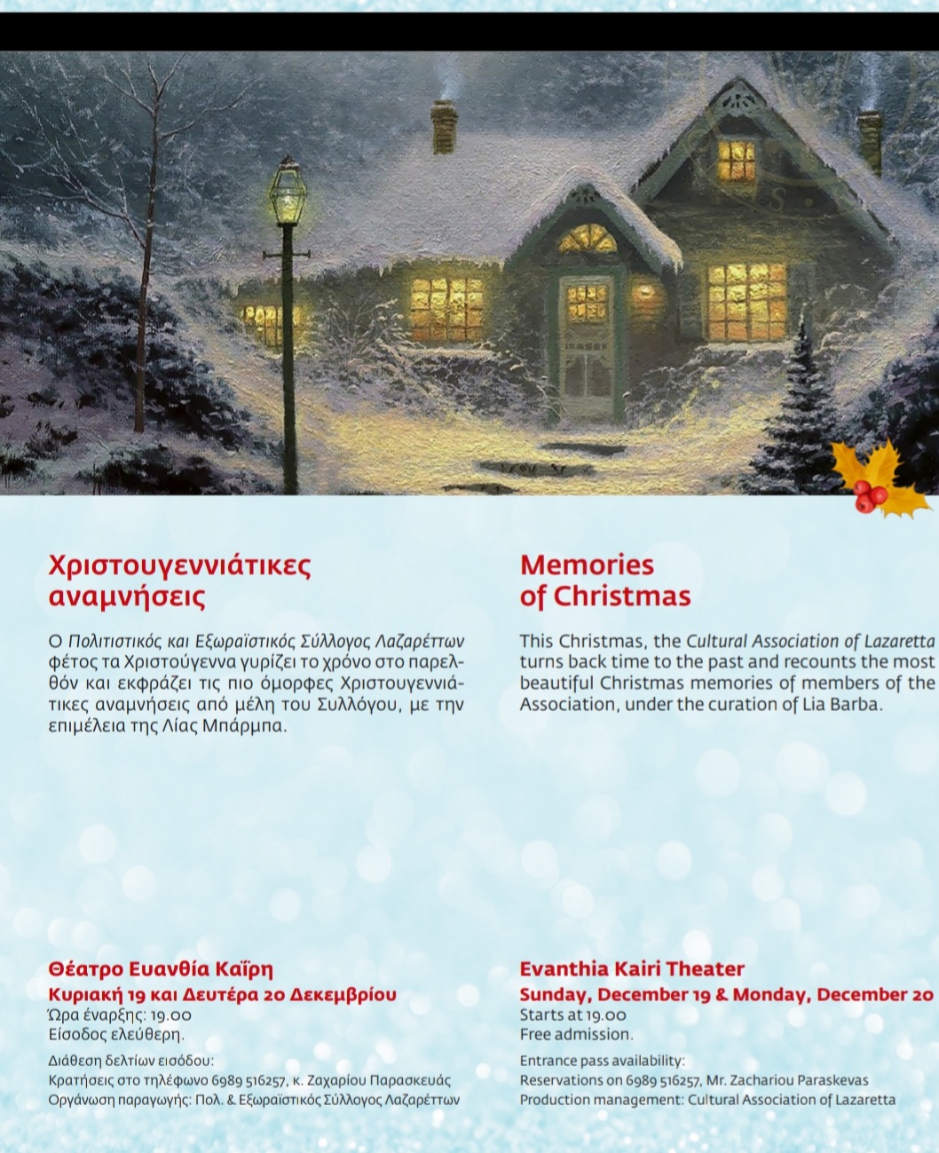 Ο Πολιτιστικός και Εξωραϊστικός Σύλλογος Λαζαρεττων φέτος τα Χριστούγεννα γυρίζει τον χρόνο στο παρελθόν και εκφράζει τις ποιο όμορφες χριστουγεννιάτικες Αναμνήσεις την Κυριακή 19 Δεκεμβρίου και την Δευτέρα 20 Δεκεμβρίου στις 19:00 Στο θέατρο Ευανθία Καΐρη στα Λαζαρέττα!!