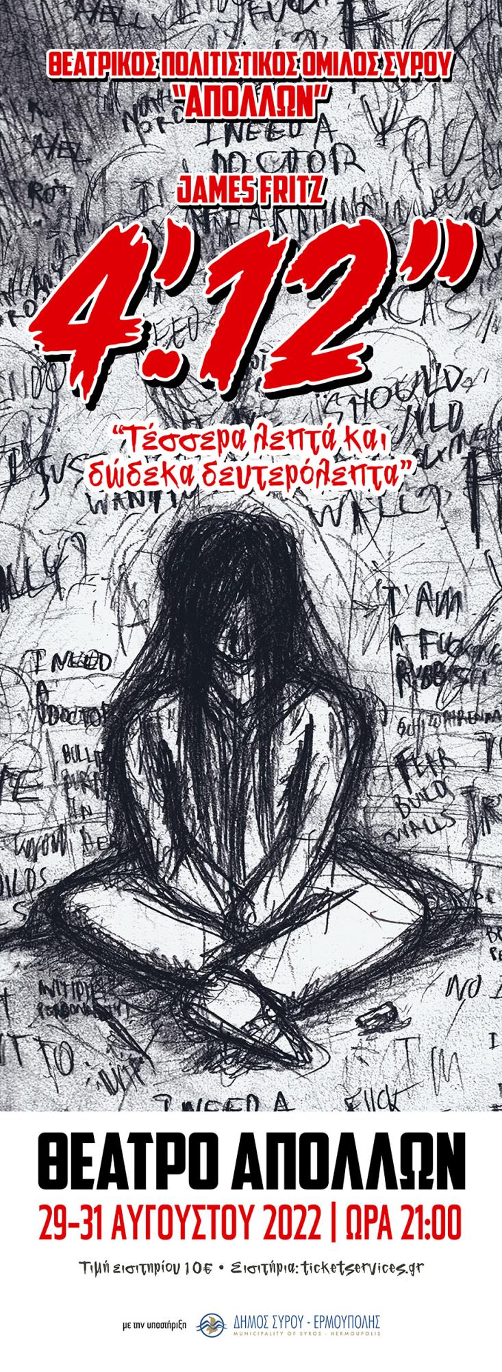 Ο Θεατρικός Πολιτιστικός Όμιλος Σύρου «ΑΠΟΛΛΩΝ» παρουσιάζει από τη Δευτέρα 29 Αυγούστου έως και την Τετάρτη 31 Αυγούστου 2022 το έργο του James Fritz «4 Λεπτά και 12 Δευτερόλεπτα» στο θέατρο ΑΠΟΛΛΩΝ, ώρα 21:00.