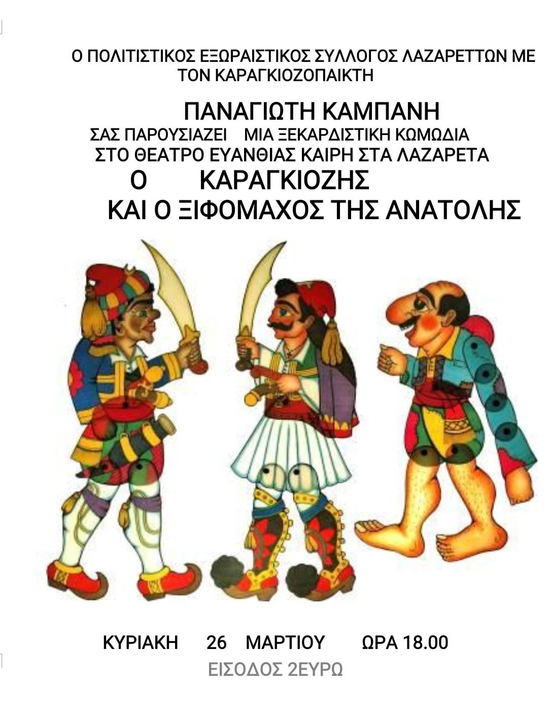 Την Κυριακή 26 Μαρτίου 2023 η παράσταση "Ο Καραγκιόζη και ο ξιφομάχος της Ανατολής". Θέατρο Σκιών - Διοργάνωση: Πολιτιστικός & Εξωραϊστικός Σύλλογος Λαζαρέττων.