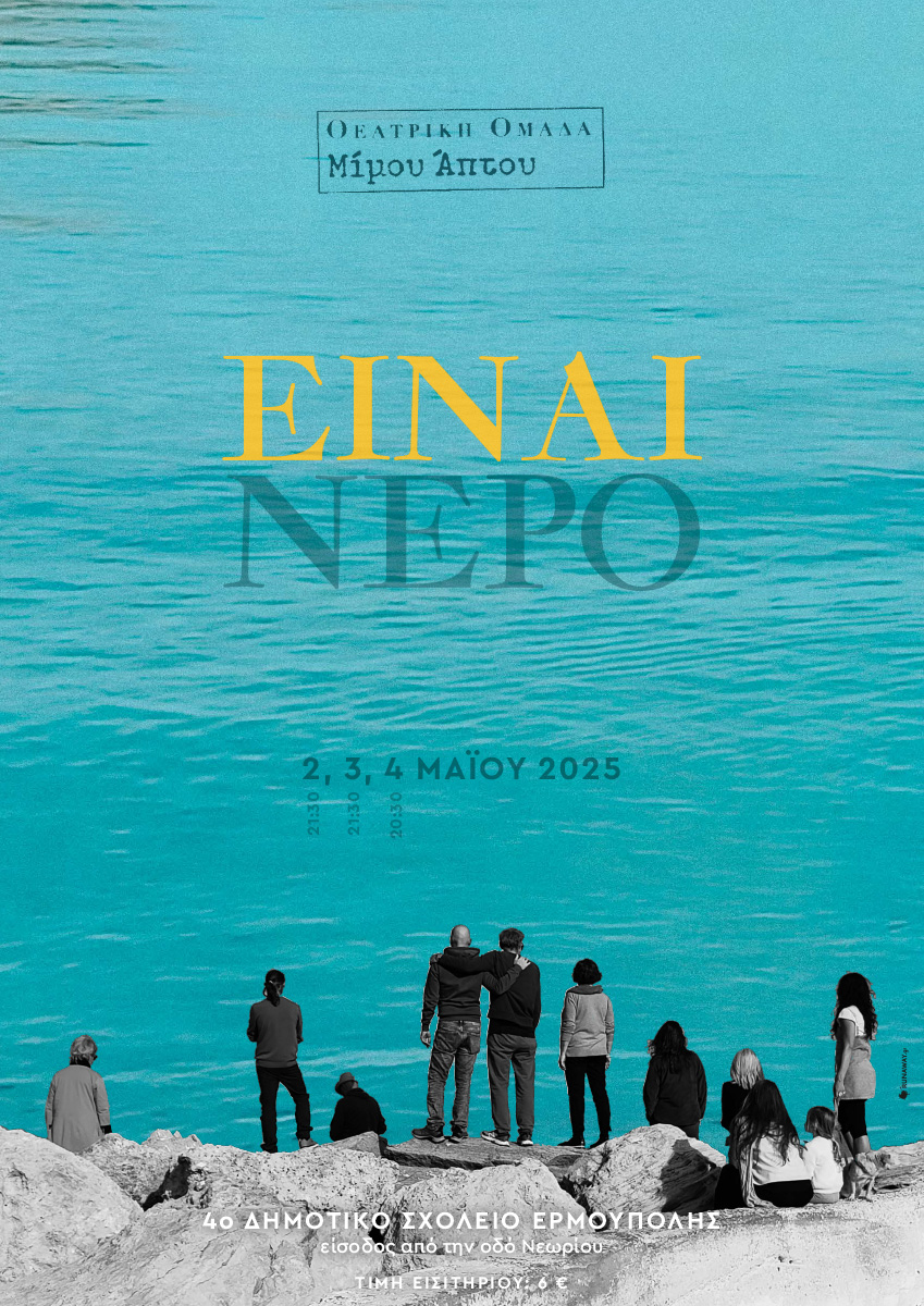 Συγκεκριμένα, μέσα από αυτοσχεδιασμούς, θεατρικές συναντήσεις και πειραματισμούς, ζυμώσεις, συγγραφή κειμένων και κυρίως παιχνίδι, οι Μίμου Άπτου παρουσιάζουν στις 2, 3 και 4 Μαΐου, στην αίθουσα εκδηλώσεων του 4ου Πειραματικού Δημοτικού Σχολείου Ερμούπολης, το έργο "Είναι Νερό".