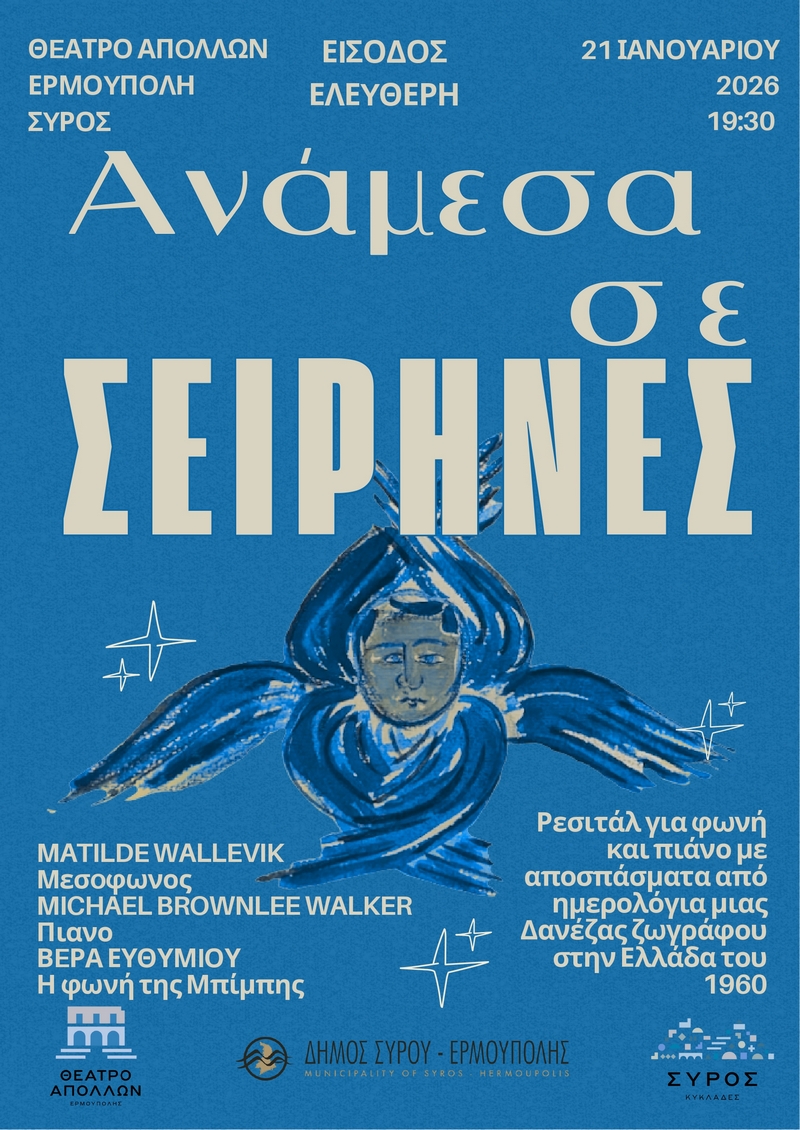 “Ανάμεσα σε σειρήνες”, τιτλοφορείται το ρεσιτάλ για φωνή και πιάνο που θα πραγματοποιηθεί την Τετάρτη 21 Ιανουαρίου στις 7 και μισή το βράδυ στο θέατρο Απόλλων της Ερμούπολης.