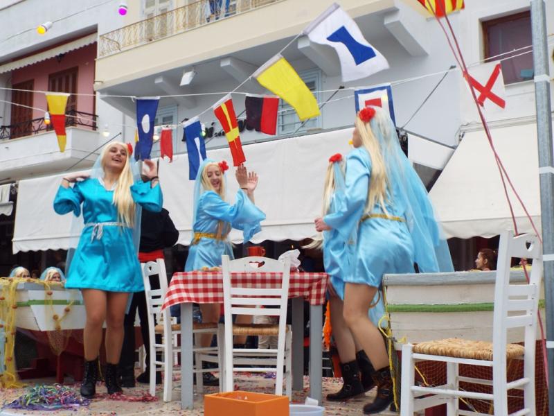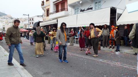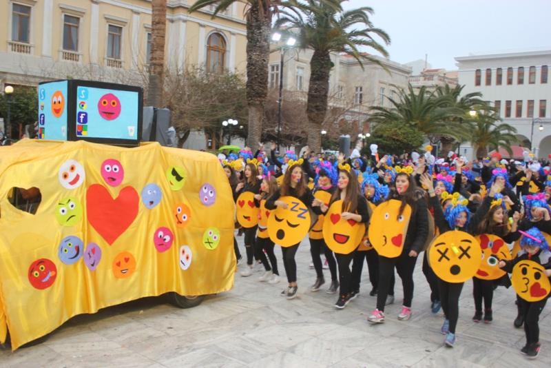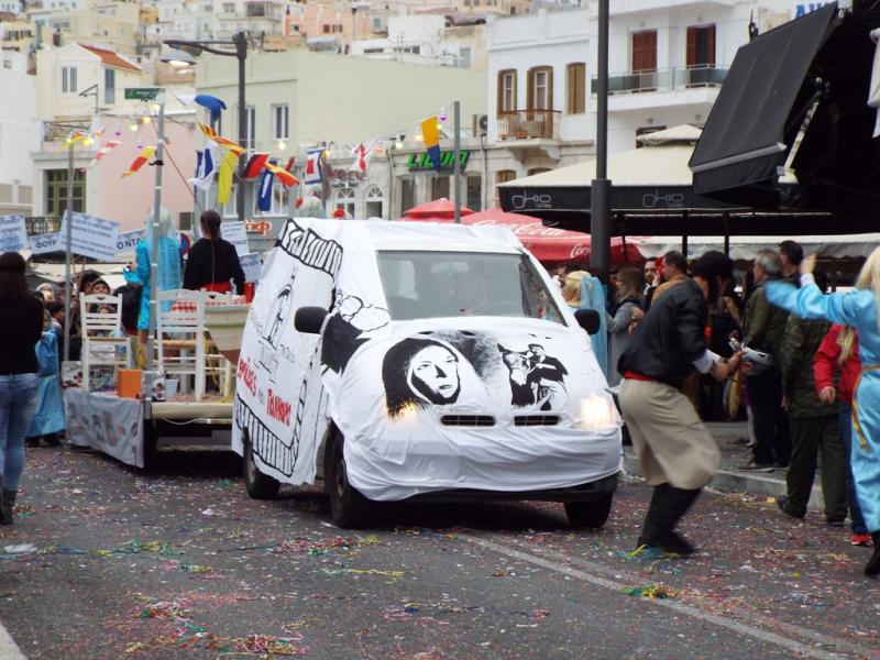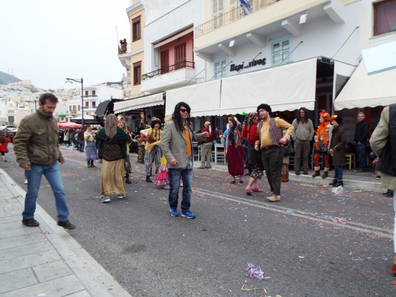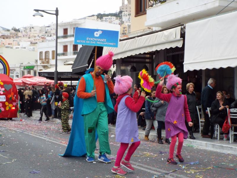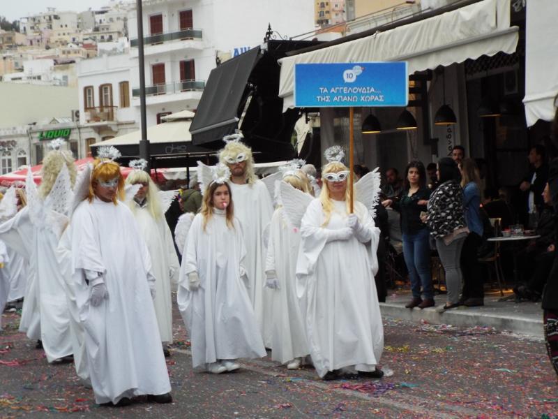 Στη “Χωνολουλού” πήγαν φέτος οι Ωραίοι που έχουν χρέη, ενώ τα αγγελούδια της Απάνω Χώρας έριξαν τις ζεϊμπεκιές τους στην πλατεία Μιαούλη. Από το διάστημα κατέβηκαν φέτος οι Vourvourigans για έναν διαφορετικό πόλεμο των άστρων και από τα προϊστορικά Χάλαρα κατέφτασαν οι Φλίντστοουνς της Ομάδας Πεζοπόρων Σύρου. Οι “Άνω Ποταμών” παρουσίασαν το θέμα “Σουβλάκι Φουέστερν και Πράσσειν Άλογα” και η παρέλαση ολοκληρώθηκε με τις ¨”ψυχές” του Φοιτητικού Συλλόγου του Τμήματος Μηχανικών Σχεδίασης Προϊόντων και Συστημάτων του Πανεπιστημίου Αιγαίου.
