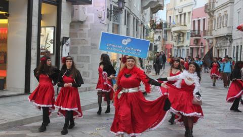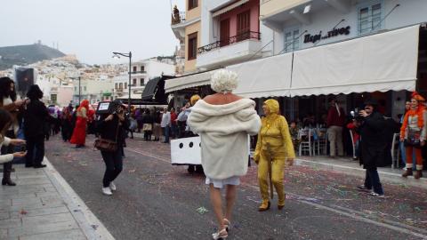 Η μεγάλη παρέλαση των καρναβαλικών ομάδων στους δρόμους της Ερμούπολης πραγματοποιήθηκε το απόγευμα της Κυριακής, παρουσία πλήθους κατοίκων και επισκεπτών του νησιού που ενθάρρυναν και αποθέωναν τους συμμετέχοντες με επευφημίες και το ζεστό "χειροκρότημά" τους.