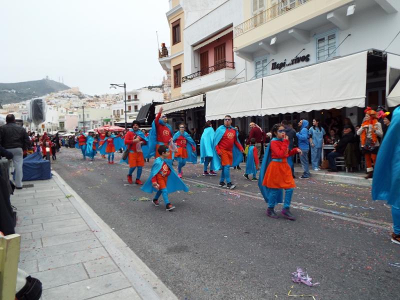 Την παρέλαση των καρναβαλικών ομάδων άνοιξαν τα μέλη του Πολιτιστικού Συλλόγου Στροπώνων Ευβοίας με το θέμα “Ό,τι φάμε, ό,τι πιούμε κι ό,τι...”. Ακολούθησαν οι “Γονδολιέρηδες” του “Αγίου Γεωργίου” και οι “φατσούλες” του 6ου Δημοτικού Σχολείου. Πρόωρα έφεραν το φετινό καλοκαίρι οι “σαγιονάρες” του Δημοτικού Σχολείου και Νηπιαγωγείων Βάρης – Μάννα και αμέσως μετά η Ερμούπολη έγινε πολύχρωμη με τους Ευχούληδες του Δημοτικού Σχολείου Άνω Σύρου. Ακολούθησαν οι “superοχοι” του 4ου Δημοτικού Σχολείου, ενώ οι παιδικές ομάδες ολοκληρώθηκαν με τον “Γυφτομαχαλά από την Χαλάστρα” του Χορευτικού Συλλόγου Χαλάστρας ΚΠΟΔΔ Θεσσαλονίκης και ¨Του Κουτρούλη τον Γάμο” από τον Λαογραφικό Αθλητικό Σύλλογο Μεσολογγίου.