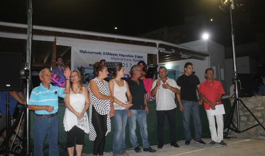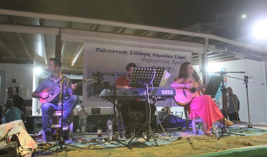 Στο πλαίσιο του προγράμματος «Σύρος - Πολιτισμός 2017», ο Κοινωνικός Πολιτιστικός και Μορφωτικός Σύλλογος Καμινίων Σύρου επέστρεψε δυναμικά για ένα ακόμη μουσικό ραντεβού με τους φίλους τους, αποχαιρετώντας το φετινό καλοκαίρι, όπως μας έχει συνηθίσει εδώ και πολλά χρόνια.