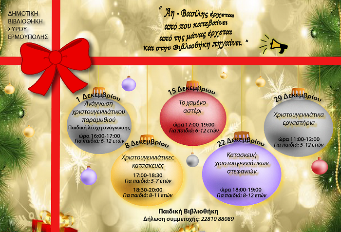 Την πιο αγαπημένη γιορτή του χρόνου υποδέχεται η Δημοτική Βιβλιοθήκη Ερμούπολης με μια σειρά χριστουγεννιάτικων δράσεων για τους μικρούς φίλους της που θα πραγματοποιηθούν όλο το Δεκέμβριο.