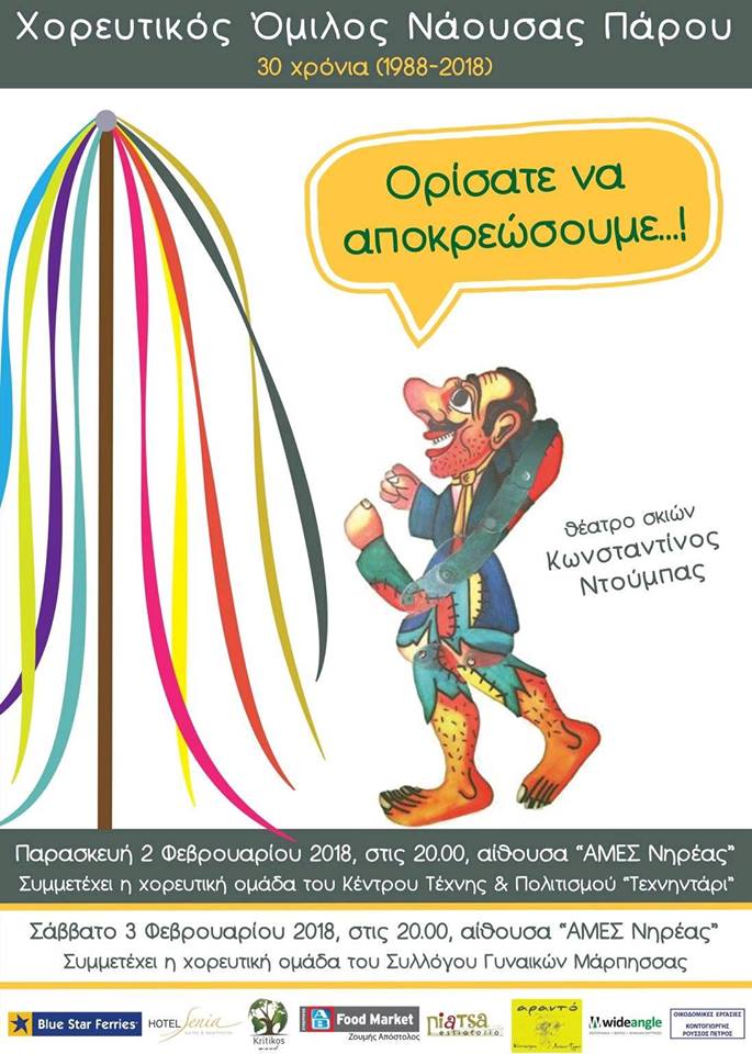 Ο Χορευτικός Όμιλος Νάουσας, ο οποίος συμπληρώνει φέτος 30 χρόνια ενεργούς παρουσίας στα πολιτιστικά δρώμενα της Πάρου, υποδέχεται το 2018 με τη χορευτική παράσταση "Ορίσατε να αποκρεώσουμε".