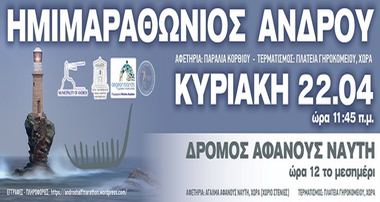 Στο πλαίσιο της διοργάνωσης του 2ου Ημιμαραθωνίου Άνδρου στις 22 Απριλίου 2018, ο Δήμος Άνδρου γνωστοποιεί ότι ξεκίνησαν οι εγγραφές για τον Ημιμαραθώνιο, καθώς και για τον Αγώνα Δρόμου Αφανούς Ναύτη (10 χλμ.).
