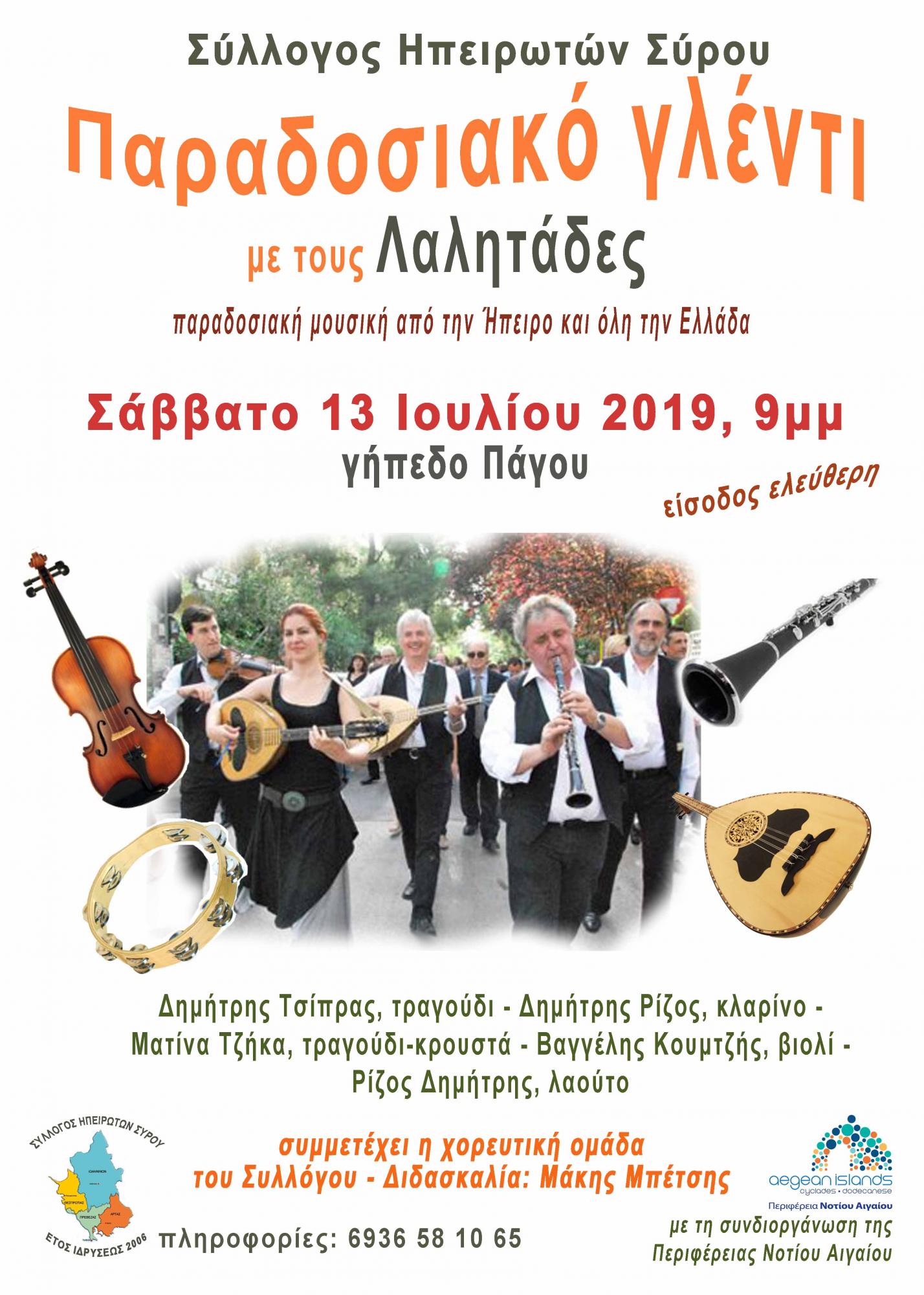 Σας περιμένουμε στο γήπεδο μπάσκετ του Πάγου το Σάββατο 13 Ιουλίου 2019 και ώρα 21.00, να γλεντήσουμε με τους "Λαλητάδες" (http://www.lalitades.gr/), με παραδοσιακή μουσική από την Ήπειρο και όλη την Ελλάδα.
