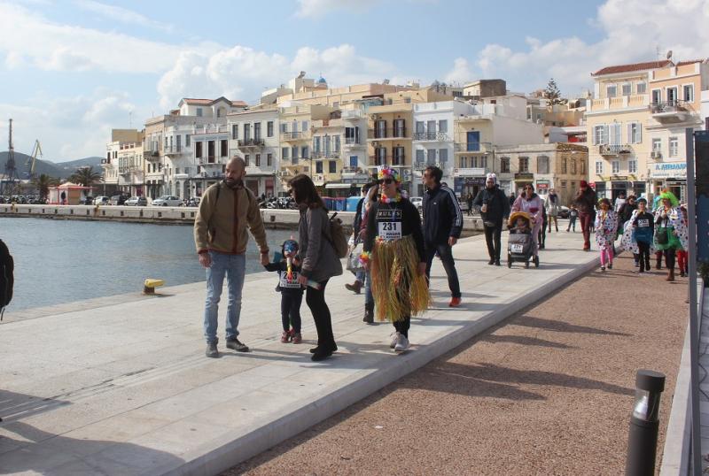 Με απαραίτητο αξεσουάρ τη μάσκα τους, οι συμμετέχοντες ξεκίνησαν από το σημείο των ΚΤΕΛ Σύρου και διένυσαν όλη την παραλιακή οδό, τραβώντας τα βλέμματα των περαστικών και των θαμώνων των επιχειρήσεων εστίασης. Οι καρναβαλικοί runners τερμάτισαν στην πλατεία Μιαούλη, όπου έλαβαν συγχαρητήρια από τους παρουσιαστές της μεγάλης διοργάνωσης Μαριάννα Βακονδίου και Γιώργο Ρούσσο και την Αντιδήμαρχο Πολιτισμού, Αλίκη Λεονταρίτη.