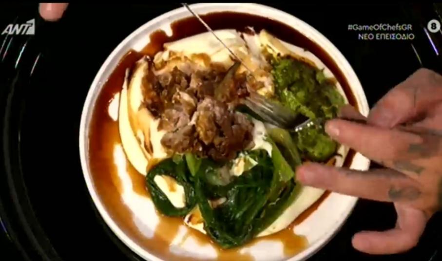 Οι τρεις κριτές δοκίμασαν το πιάτο του και εντυπωσιαστήκαν. Ιδιαίτερα ενθουσιασμένος ήταν ο Άνταμ Κοντοβάς ο οποίος μάλιστα είπε χαρακτηριστικά «μόλις είδαμε τον νικητή του Game of Chefs», με τον Άγγελο Λάντο να του λέει να συγκρατηθεί.