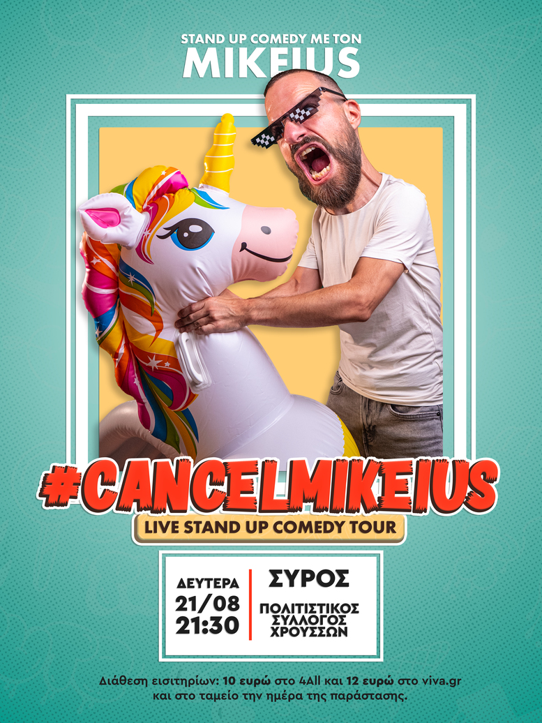 Από την παράσταση του #CancelMikeius που θα πραγματοποιηθεί σε Σύρο και Τήνο, περνάνε θέματα, όπως η Cancel Culture, η Πολιτική Ορθότητα αλλά και αγαπημένες του συζητήσεις, όπως τα 80’s και τα 90’s, οι σχέσεις των δύο φύλων και δεκάδες λεπτομέρειες που συναντάει κάθε άνθρωπος στην καθημερινή του ζωή και περνάνε απαρατήρητες.