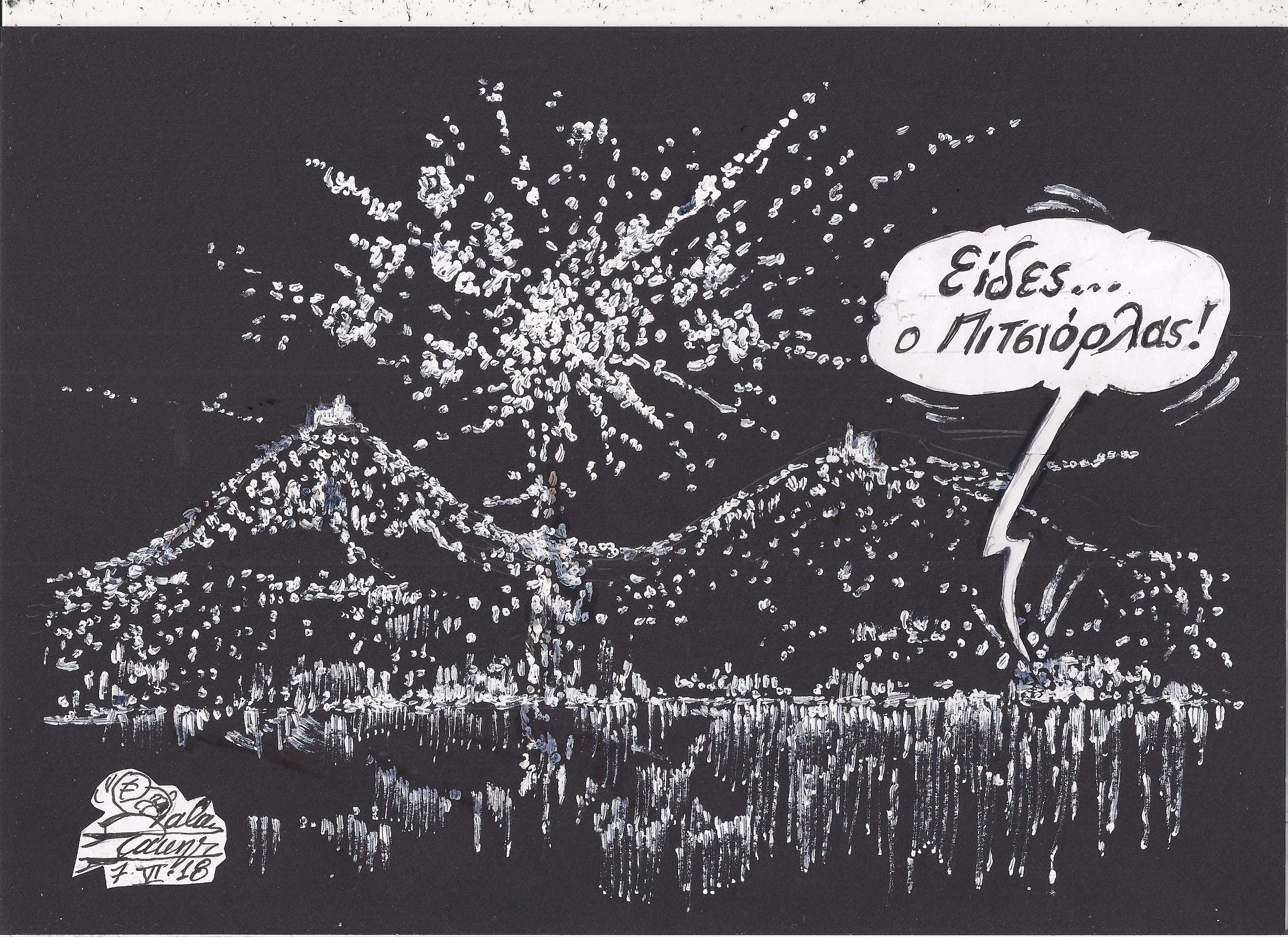 Σκίτσο του Τάκη Χάλαρη με θέμα: "Πυροτεχνήματα από το Νεώριο"