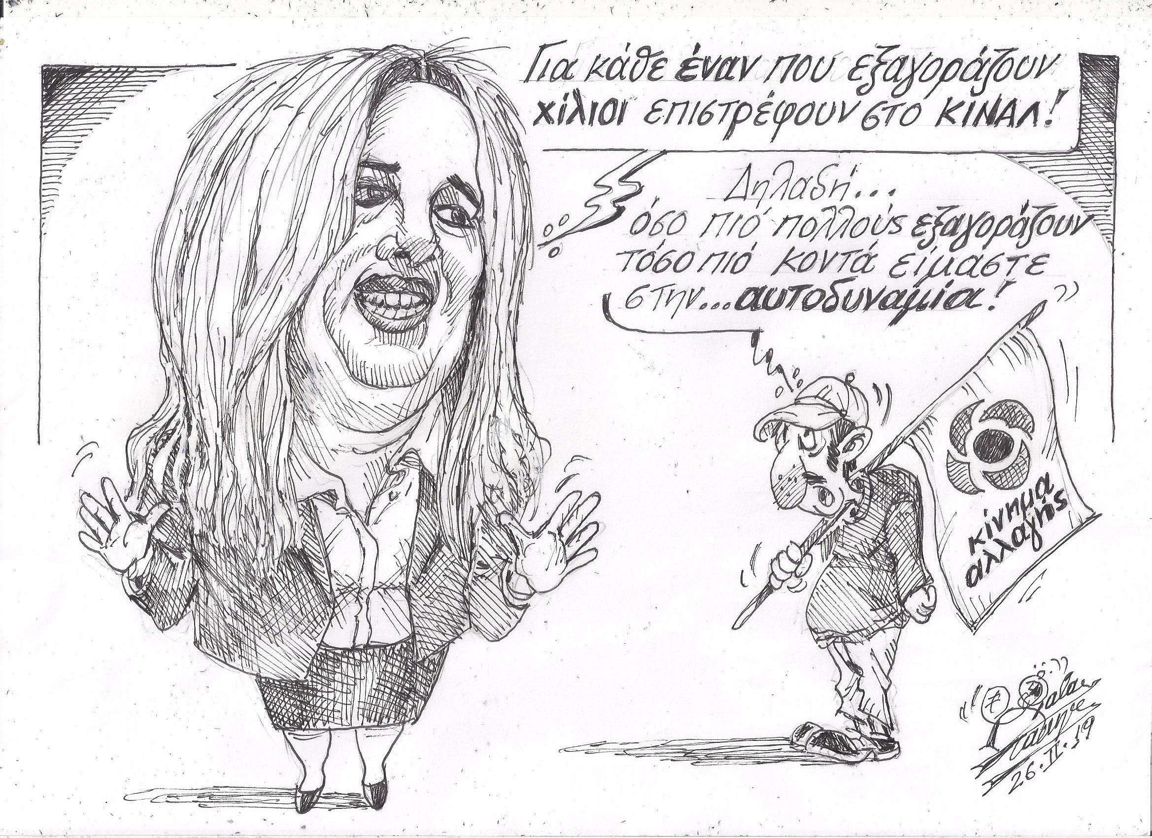 Σκίτσο του Τάκη Χάλαρη με θέμα: "Εξαγορές - Επιστροφές"