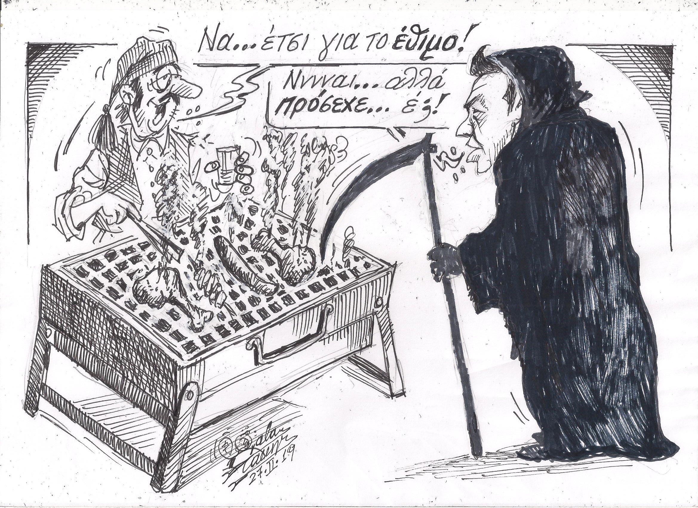 Σκίτσο του Τάκη Χάλαρη με θέμα: "Τσικνοπέμπτη"