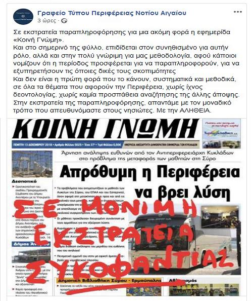 Το να βγάζει τα πρωτοσέλιδα της «Κοινής Γνώμης» σε χορηγούμενες αναρτήσεις στο facebook, με πηχυαίους τίτλους που μας προσάπτουν «συκοφαντία», σίγουρα δεν συνιστά σοβαρή πολιτική αντιμετώπιση, παρά προδίδει απόγνωση και πανικό.