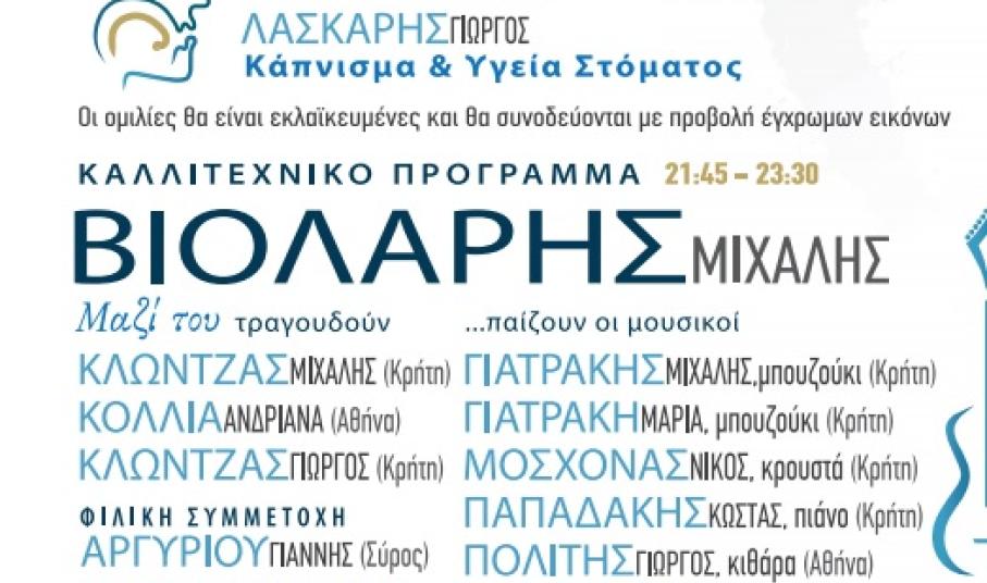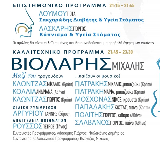 Το Επιστημονικό Πρόγραμμα περιλαμβάνει δύο εκλαϊκευμένες ομιλίες, βραχείας διάρκειας, που αφορούν συνήθη καθημερινά προβλήματα στο στόμα και σχετίζονται με το Κάπνισμα και τον Σακχαρώδη Διαβήτη. Το Καλλιτεχνικό Πρόγραμμα περιλαμβάνει μεγάλη καλλιτεχνική συναυλία με υψηλού επιπέδου καλλιτέχνες από την Αθήνα, την Κρήτη και τη Σύρο.