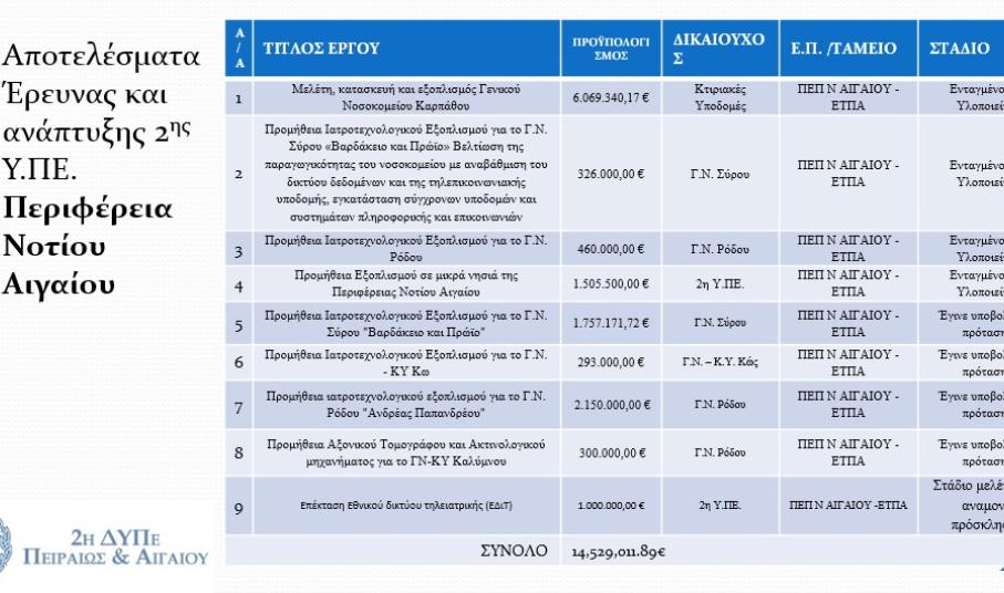 Από το Πρόγραμμα Δημοσίων Επενδύσεων και το Πρόγραμμα Ειδικού Σκοπού 2017, χρηματοδοτήθηκαν 11 έργα, με συνολικό προϋπολογισμό 4.185.253 ευρώ, μεταξύ των οποίων και το βραβευμένο με το βραβείο I.T. Exellence Gold (BITE) Εθνικό Δίκτυο Τηλεϊατρικής (ΕΔιΤ). Το δίκτυο έχει ως βασικούς στόχους την παροχή εξειδικευμένων υπηρεσιών υγείας σε τακτικά κα έκτακτα περιστατικά σε απομακρυσμένα νησιά του Αιγαίου, τη συνεχή εκπαίδευση του ιατρονοσηλευτικού προσωπικού των νησιωτικών Κέντρων Υγείας και των Πολυδύναμων Ιατρείων και τη χρήση για διοικητική υποστήριξη.