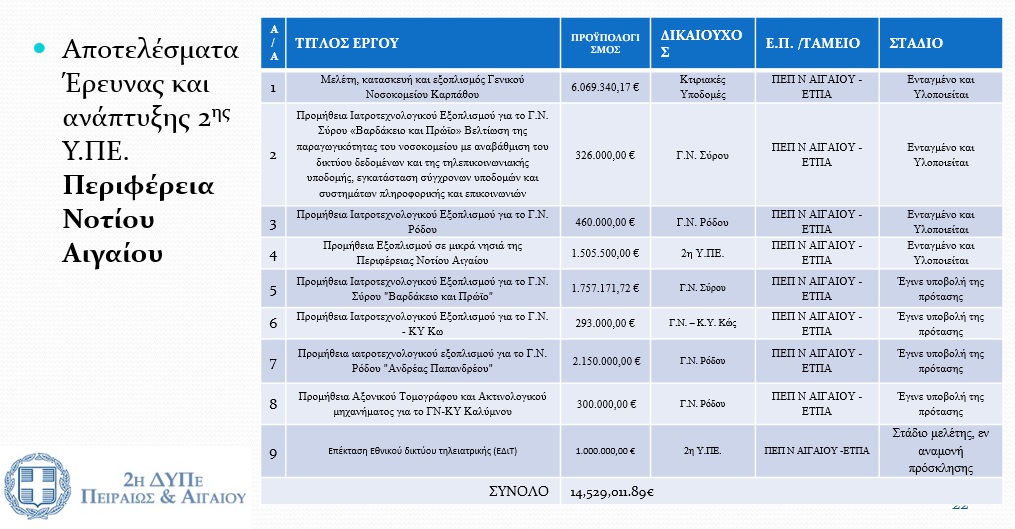 Σε μία αναλυτική παρουσίαση, περιγράφεται η πορεία υλοποίησης σημαντικών δράσεων, για την αναβάθμιση των υπηρεσιών των μονάδων υγείας, όλων των βαθμίδων, μεταξύ των οποίων και οι δευτεροβάθμιες και πρωτοβάθμιες μονάδες, που εδρεύουν στον νομό Κυκλάδων και για τις οποίες είναι υπεύθυνη η 2η ΥΠΕ.