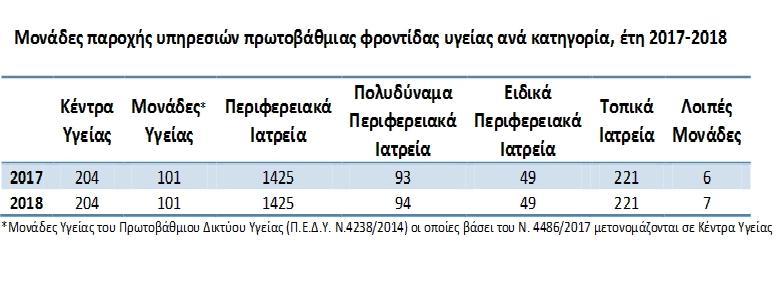 Η Ελληνική Στατιστική Αρχή (ΕΛΣΤΑΤ) ανακοίνωσε τα στοιχεία αναφορικά με τις Μονάδες Πρωτοβάθμιας Φροντίδας Υγείας (Π.Φ.Υ) για τα έτη 2017 και 2018.