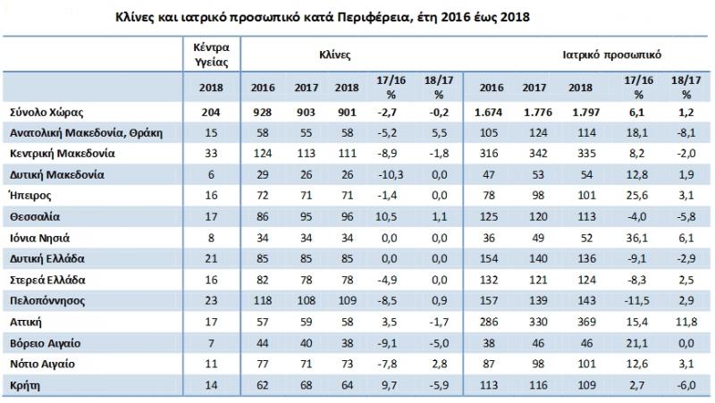 Η δύναμη των κλινών που βρίσκονται στα Κέντρα Υγείας μειώθηκε κατά 0,2% το 2018 σε σύγκριση με το 2017 και κατά 2,7% το 2017 σε σύγκριση με το 2016 στο σύνολο της χώρας.
