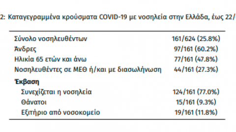 Υπενθυμίζεται πως τα στοιχεία περιλαμβάνουν και ασθενείς που νοσηλεύτηκαν ή διασωληνώθηκαν τις προηγούμενες ημέρες, αλλά δηλώθηκαν και καταγράφηκαν στον ΕΟΔΥ το τελευταίο 24ωρο.