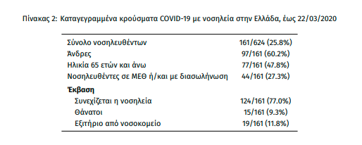 Σύμφωνα με τα στοιχεία που έχουν δηλωθεί στον ΕΟΔΥ, στις 22 Μαρτίου 2020 συνεχίζουν να νοσηλεύονται 124 ασθενείς, εκ των οποίων 34 (27.4%) έχουν διασωληνωθεί.