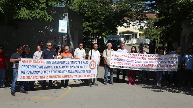 Στο πλαίσιο της χθεσινής πανελλαδικής απεργίας, ιατρικό και νοσηλευτικό προσωπικό αλλά και εργαζόμενοι στο Γενικό Νοσοκομείο Λάρισας, παρουσία συνδικαλιστών του ΕΚΛ, της ΑΔΕΔΥ, εκπαιδευτικών, συνταξιουχικών και γυναικείων οργανώσεων, συγκεντρώθηκαν το πρωί στην πύλη του νοσοκομείου διατρανώνοντας το αίτημα της προστασίας του δημοσίου χαρακτήρα του συστήματος υγείας αλλά και της ενίσχυσης των νοσοκομείων με προσωπικό και πόρους εκφράζοντας παράλληλα την αντίθεσή τους στα σχέδια της κυβέρνησης για το Νέο Εθνικό Σύστημα Υγείας (ΝΕΣΥ).