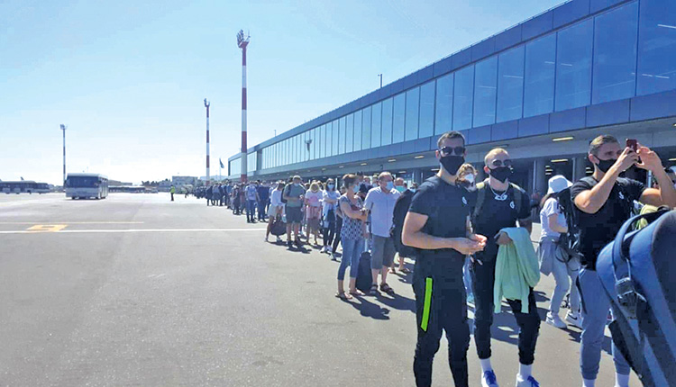 Υπάρχουν μέρες που οι ουρές των επιβατών φθάνουν μέχρι τον διάδρομο στην πίστα. Πηγές του αεροδρομίου περιγράφουν ότι οι ουρές φθάνουν και τα 200 μέτρα με τους τουρίστες να «καίγονται» κάτω από τον καυτό ήλιο και να διαμαρτύρονται.
