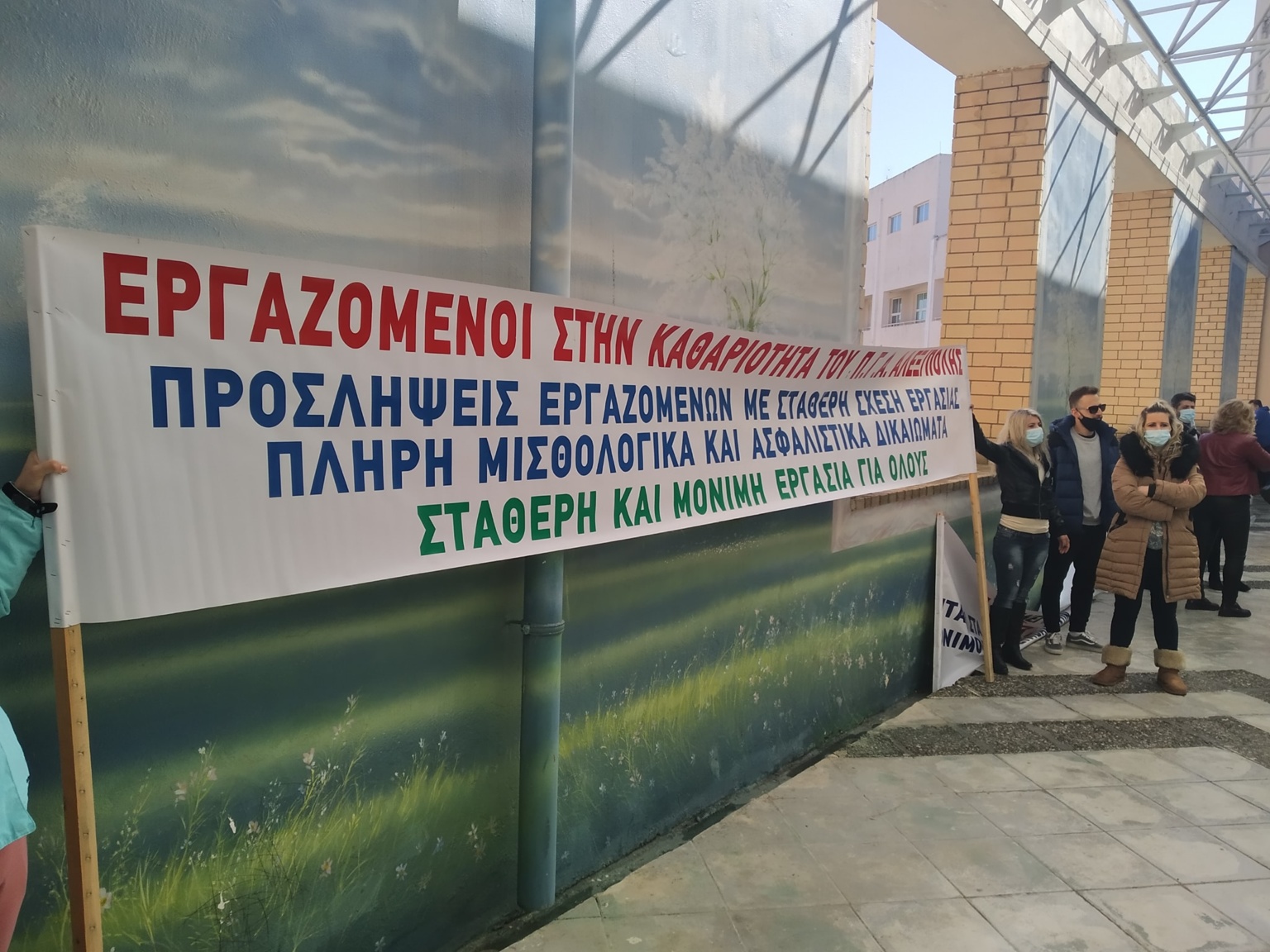 Χαρακτηριστικό ήταν το κεντρικό πανό των εργαζομένων στην καθαριότητα που διεκδικούν προσλήψεις εργαζομένων με σταθερή σχέση εργασίας, πλήρη μισθολογικά και ασφαλιστικά δικαιώματα, σταθερή και μόνιμη εργασία για όλους.
