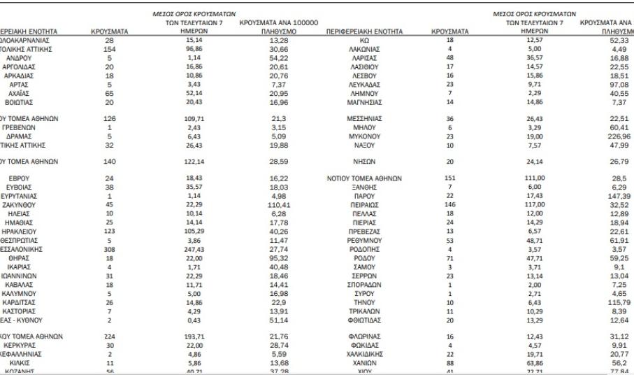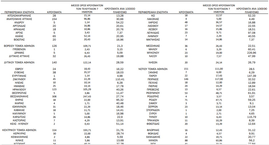 Από το σύνολο των 2.874 νέων κρουσμάτων του νέου ιού στη χώρα χθες, 15 είναι εισαγόμενα εκ των οποίων 10 εντοπίστηκαν κατόπιν ελέγχων στις πύλες εισόδου της χώρας. Η κατανομή των 2.859 νέων εγχώριων κρουσμάτων ανά Περιφερειακή Ενότητα παρουσιάζεται στον κατωτέρω πίνακα.