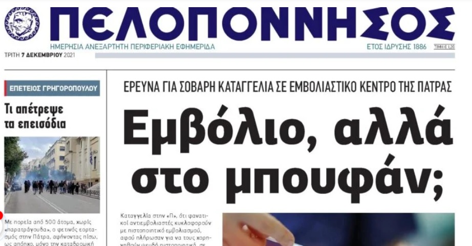 Η προϊσταμένη της Εισαγγελίας Πρωτοδικών Πατρών, Κωνσταντούλα Αθανασοπούλου, διέταξε κατεπείγουσα προκαταρκτική εξέταση, για να διαπιστωθεί η βασιμότητα ή μη των καταγγελιών που έγιναν στην εφημερίδα «Πελοπόννησος», σχετικά με γιατρό εμβολιαστικού κέντρου, ο οποίος φέρεται να έχει κάνει ψευδείς εμβολιασμούς έναντι αμοιβής.
