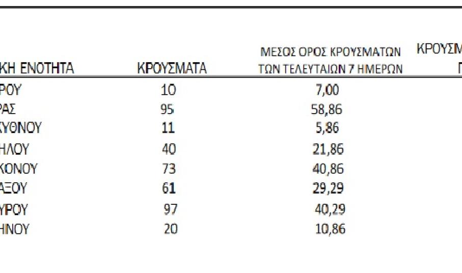 ΝΑΞΟΣ: 87 rapid test με 23 θετικά (26.44%) αφορούν σε 11 άνδρες και 12 γυναίκες με διάμεση ηλικία τα 54 έτη.