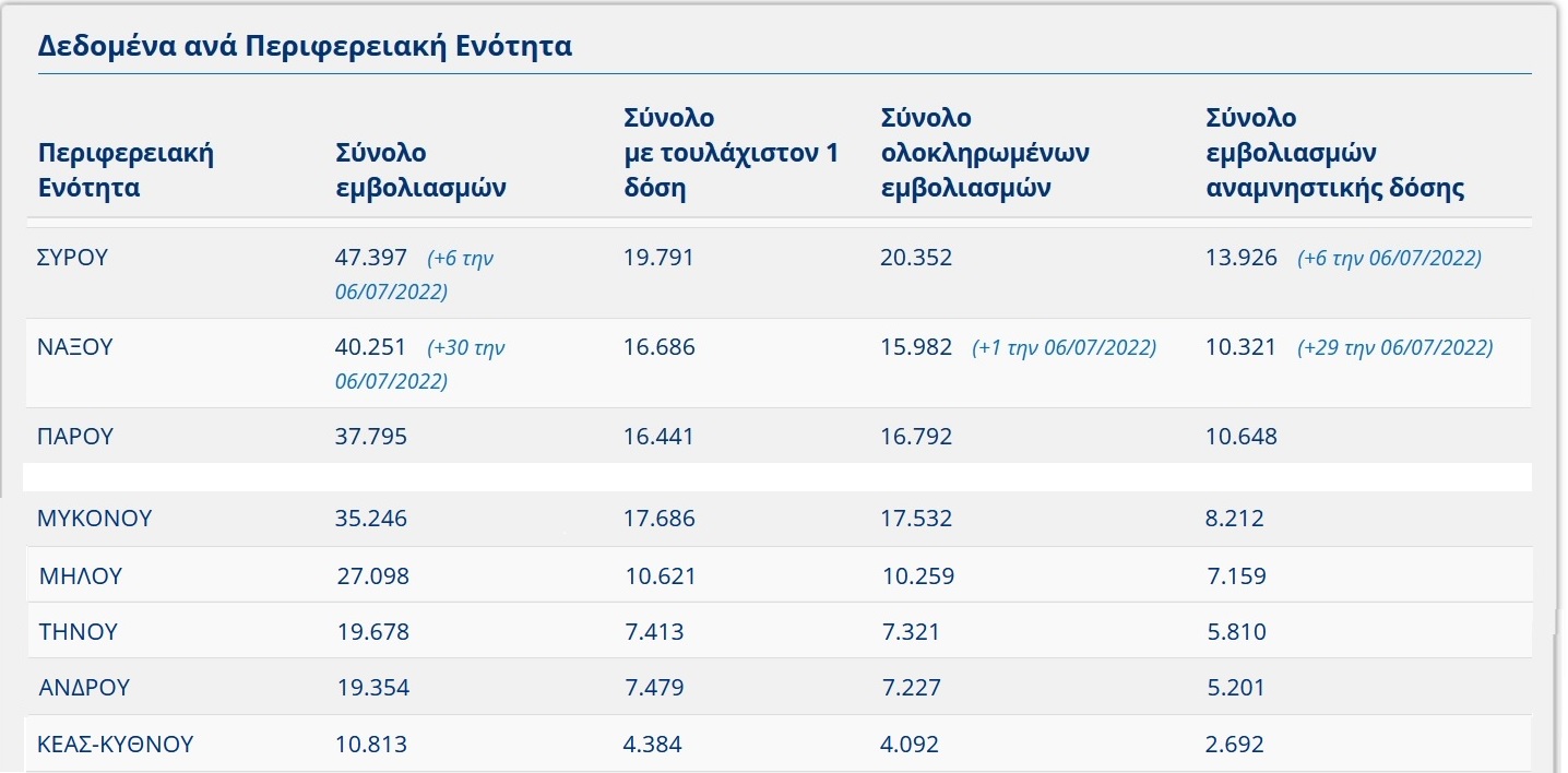 Από την κατανομή του συνόλου των νέων κρουσμάτων στα νησιά των Κυκλάδων προκύπτει πως το τελευταίο 24ωρο στην Περιφερειακή Ενότητα Άνδρου καταγράφηκαν 10 νέα κρούσματα, στην Περιφερειακή Ενότητα Θήρας 75 νέα κρούσματα, στην Περιφερειακή Ενότητα Κέας – Κύθνου 12 νέα κρούσματα, στην Περιφερειακή Ενότητα Μήλου 32 νέα κρούσματα, στην Περιφερειακή Ενότητα Μυκόνου 53 νέα κρούσματα, στην Περιφερειακή Ενότητα Νάξου 37 νέα κρούσματα, στην Περιφερειακή Ενότητα Πάρου 69 νέα κρούσματα, στην Περιφερειακή Ενότητα Σύρου 44 νέα κρούσματα και στην Περιφερειακή Ενότητα Τήνου 20 νέα κρούσματα.