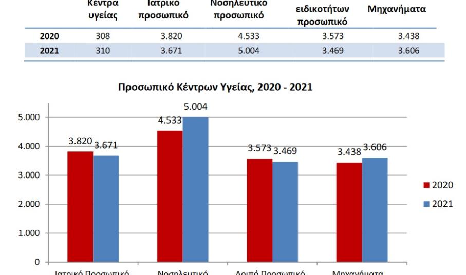 • Ο αριθμός του ιατρικού προσωπικού που απασχολείται στα Κέντρα Υγείας παρουσίασε μείωση κατά 3,9% το 2021 σε σχέση με το 2020, στο σύνολο της χώρας. Αύξηση παρατηρείται το 2021 σε σχέση με το 2020 στις Περιφέρειες Κρήτης και Ιόνιων Νήσων κατά 6,6% και 5,7%, αντίστοιχα. Αντίθετα, μειώσεις παρατηρήθηκαν στις περισσότερες περιφέρειες το 2021 σε σχέση με το 2020 με μεγαλύτερες μειώσεις στις Περιφέρειες Θεσσαλίας και Βόρειου Αιγαίου κατά 11,2% και 10,3% αντίστοιχα.