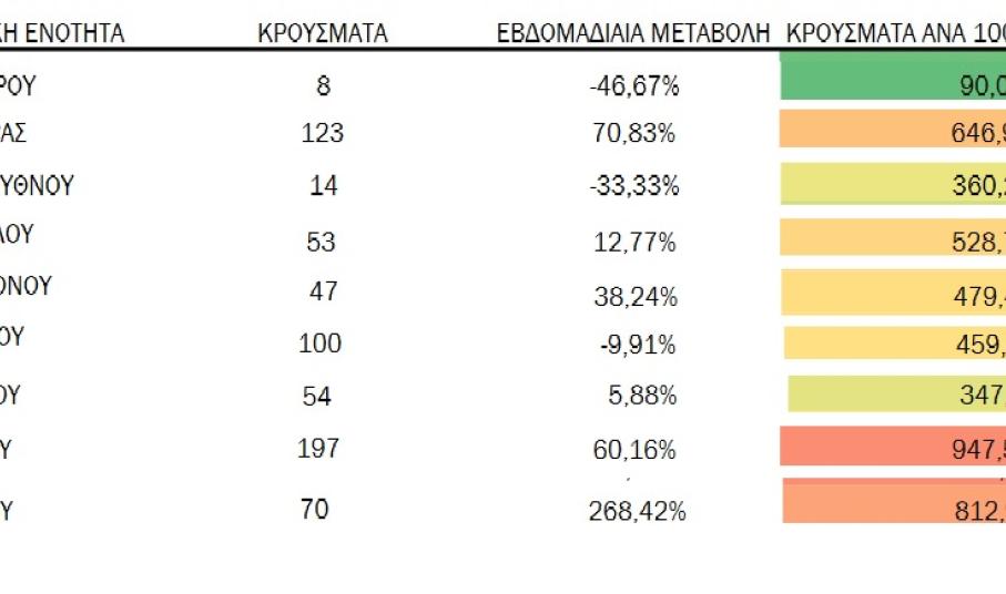 Δείγματα που έχουν ελεγχθεί: Την εβδομάδα αναφοράς, το ποσοστό θετικότητας ήταν 6,77% σε σύνολο 661.468 εργαστηριακών ελέγχων (RT-PCR/Rapid-Ag) με το μέσο όρο επταημέρου να είναι 94.495 δείγματα (7% εβδομαδιαία μεταβολή).