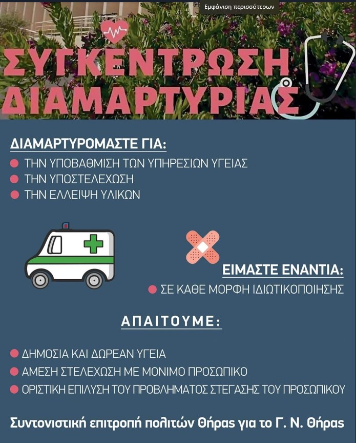 Το μόνο που έχουμε να θυμόμαστε είναι οι υποσχέσεις από την κυβέρνηση και τους εκάστοτε κομματικούς παρατρεχάμενους! Το νοσοκομείο, βρίσκεται σε καθεστώς λειτουργίας με παγκόσμια πρωτοτυπία!!!ΧΩΡΙΣ ΓΙΑΤΡΟΥΣ ΚΑΙ ΝΟΣΗΛΕΥΤΙΚΟ ΠΡΟΣΩΠΙΚΟ!!! ΤΟ ΚΛΕΙΣΙΜΟ ΤΟΥ ΝΟΣΟΚΟΜΕΙΟΥ ΕΙΝΑΙ ΔΥΣΤΥΧΩΣ ΑΝΑΠΟΦΕΥΚΤΟ!!! Για τον λόγο αυτό, απευθυνόμαστε ΣΕ ΟΛΟΥΣ τους πολίτες της Σαντορίνης! Το νοσοκομείο τους ανήκει! ΑΝ ΑΡΡΩΣΤΗΣΕΙΣ ΜΠΟΡΕΙ ΝΑ ΕΙΝΑΙ ΑΡΓΑ!Και το μόνο που μένει είναι να φωνάξουμε όλοι μαζί, ΓΙΑΤΙ ΑΥΤΗ Η ΚΑΤΑΝΤΙΑ;;; Ας ενώσουμε όλοι τις φωνές μας γιά ένα Νοσοκομείο με γιατρούς και νοσηλευτικό προσωπικό ! ΚΑΛΟΥΜΕ τους κατοίκους της Σαντορίνης στις 20/7/23 και ώρα 20:00 έξω από το νοσοκομείο, ΓΙΑ ΤΟ ΝΟΣΟΚΟΜΕΙΟ ΜΑΣ!!!"
