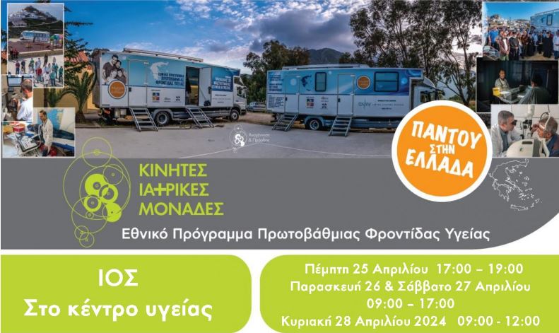 Για ακόμη μία φορά, οι κάτοικοι της Ίου θα έχουν τη χαρά να υποδεχτούν τους γιατρούς των Κινητών Ιατρικών Μονάδων. Ο επιστημονικός διευθυντής του Κέντρου Υγείας Ίου, Δημήτρης Αλβανός και ο δήμαρχος Ιητών, Γκίκας Γκίκας στο πλαίσιο της πρόληψης για τον πληθυσμό της Ίου προέβησαν σε πρόσκληση για την επίσκεψη των Κινητών Ιατρικών Μονάδων. Στο χρονικό διάστημα 25 με 28 Απριλίου οι γιατροί θα βρίσκονται στο νησί, παρέχοντας της υπηρεσίες τους δωρεάν στο Κέντρο Υγείας Ίου.