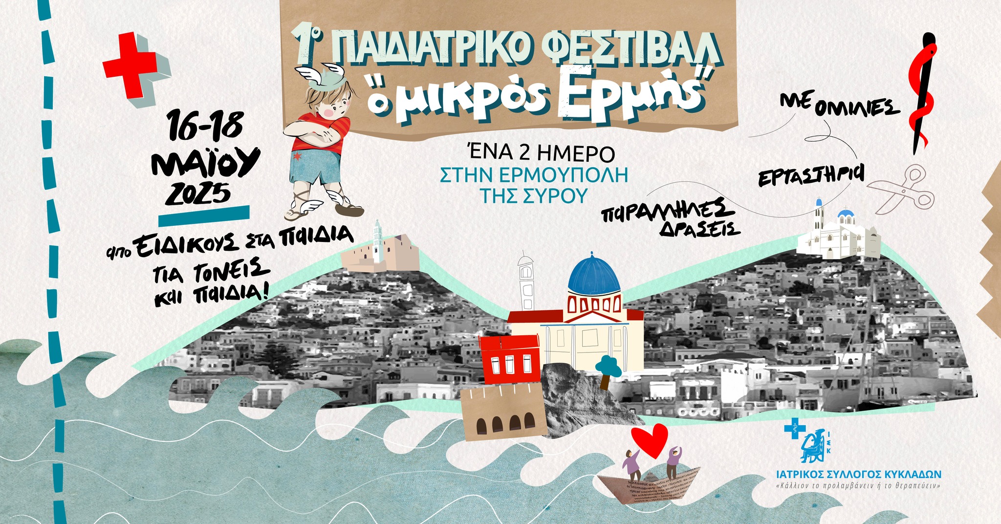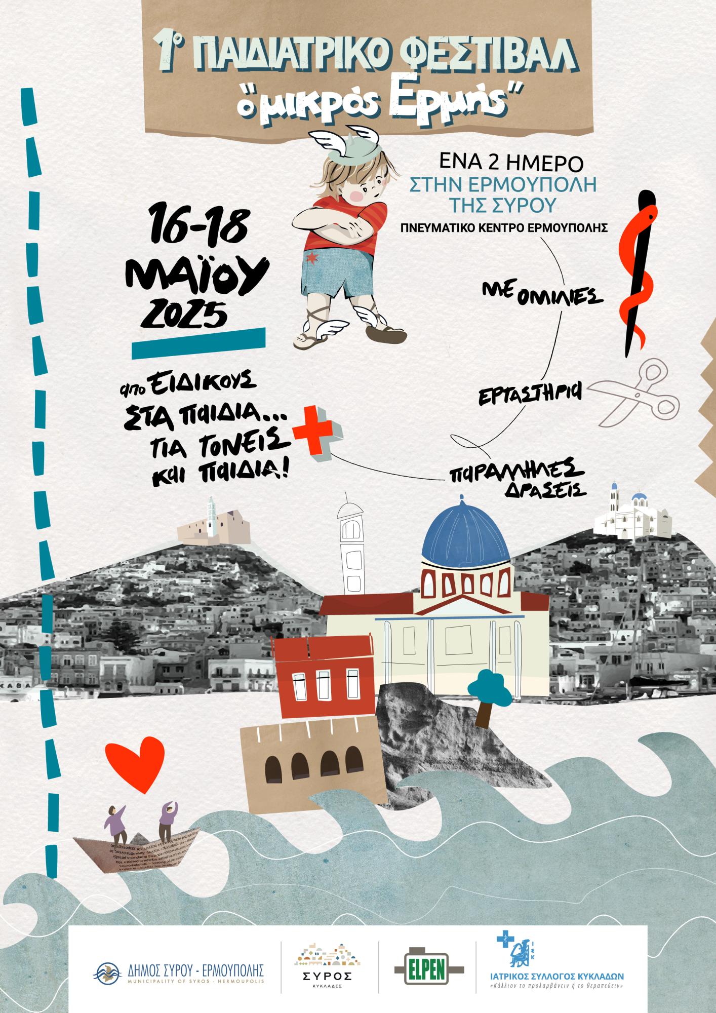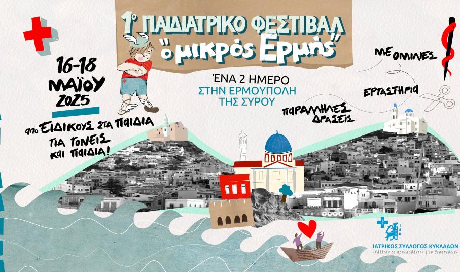 Ο Ιατρικός Σύλλογος Κυκλάδων πραγματοποιεί το 1ο Παιδιατρικό Φεστιβάλ "ο μικρός Ερμής", ένα πρωτότυπο διήμερο γνώσης, δράσεων και αλληλεπίδρασης, που θα λάβει χώρα στο Πνευματικό Κέντρο της Ερμούπολης, από τις 16 έως τις 18 Μαΐου.