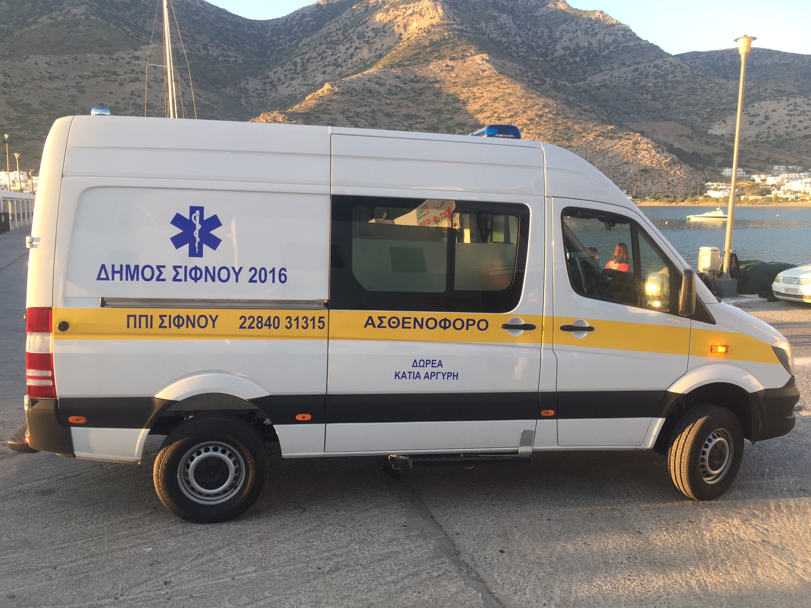 Βρισκόμαστε στην πολύ ευχάριστη θέση να σας ενημερώσουμε ότι η Σίφνος μας από την 1η Ιουνίου 2017 απέκτησε ένα νέο, υπερσύγχρονο ασθενοφόρο το οποίο θα εξυπηρετεί τις ανάγκες του Περιφερειακού μας Ιατρείου, ένα ασθενοφόρο 4X4 τύπου Mercedes, το οποίο έγινε δωρεά από τον κ. Αντώνη Αργύρη & τη σύζυγό του κα Βασιλική Καββαθά.